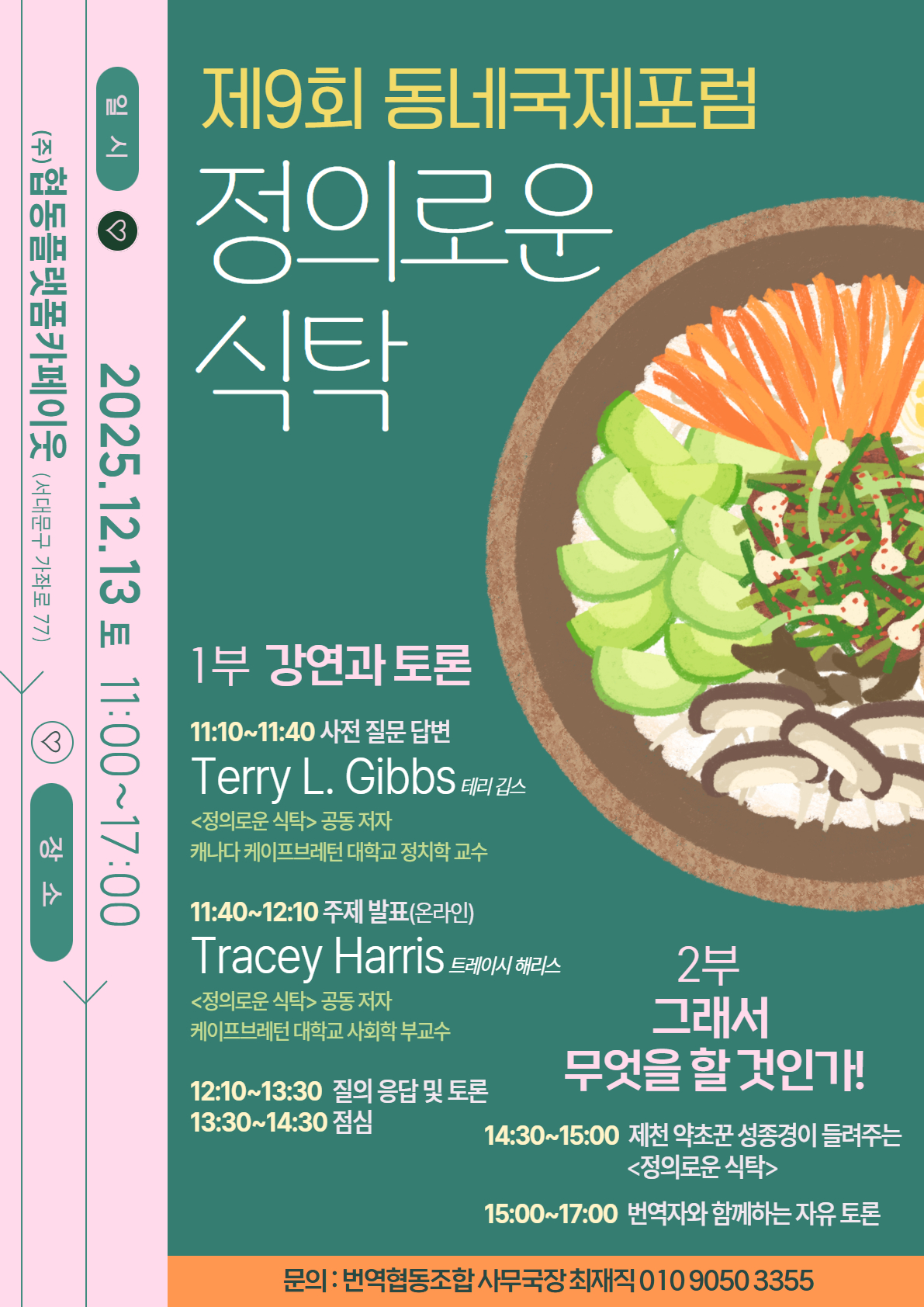 안녕하세요~ 오늘 서울은 종일 햇살이 아름다웠네요! 조합의 자랑, 동네분들과 함께하는 신나는 잔치인 동네국제포럼,12월 13일에 마을언덕사회적협동조합 1층에서 개최합니다. 벌써 9회째를 맞이했는데요!이번 동네국제포럼은 저희가 번역한 <정의로운 식탁>을 주제로,1부에는 저자 중 1명이 줌으로 주제 발표를 하고,2부에는 약초꾼과 번역자가 함께하는 토론을 진행합니다. 아래와 같이 18개 단체가 함께합니다. ^^ 아래는 신청 링크입니다. ^^https://bit.ly/제9회동네국제포럼 그리고 동네국제포럼이 소개된 라이프인 기사(9회 맞은 동네국제포럼, '정의로운 식탁'을 논하다)를 읽어보시면 저희 포럼에 더 오고 싶으실 거에요! 많은 관심 부탁드립니다!고맙습니다~